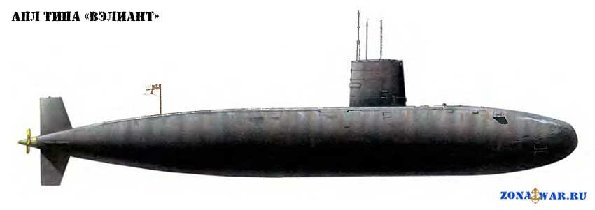 Подводная лодка ВМС Великобритании «Вэлиант» - по существу, увеличенный вариант лодки типа «Дредноут», строилась в то же время, что и вооруженные ракетами «Поларис» лодки с полностью британской ядерной энергетической установкой и сопутствующими системами управления.