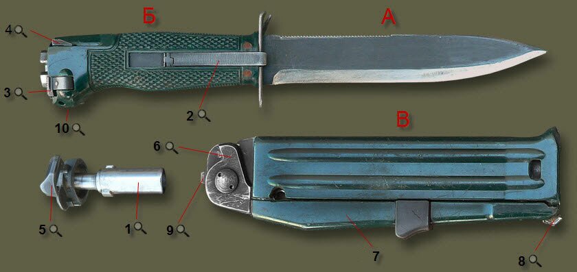 Ножны, также пластиковые, имеют сбоку рукоять кусачек, позволяющих перекусывать стальную проволоку диаметром 2,5 миллиметра, свитую в две жилы и находящуюся под напряжением до 380 вольт, или телефонный кабель диаметром 5 миллиметров. Клинок ножа в ножнах фиксируется широкой пластинчатой пружиной.