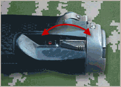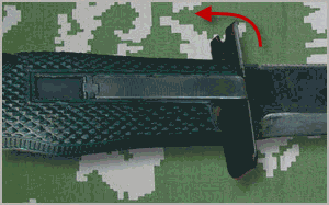 Флажок предохранителя при этом должен находиться в положении «огонь». Потом следует взять нож в руки клинком к себе так, чтобы спусковой рычаг оказался под правым указательным пальцем, клинок зажат между ладонями, перекрестье упирается в основания больших пальцев. Остальные пальцы снизу, пальцы левой руки поверх пальцев правой и ни в коем случае не на дульном срезе. Прицеливаться необходимо при помощи прорези на перекрестье-ограничителе и мушки на конце рукоятки.