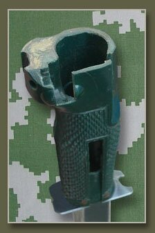 Рукоять ножа выполнена из пластика зелёного (в некоторых опытных экземплярах -коричневого) цвета, с крупным сетчатым рифлением.