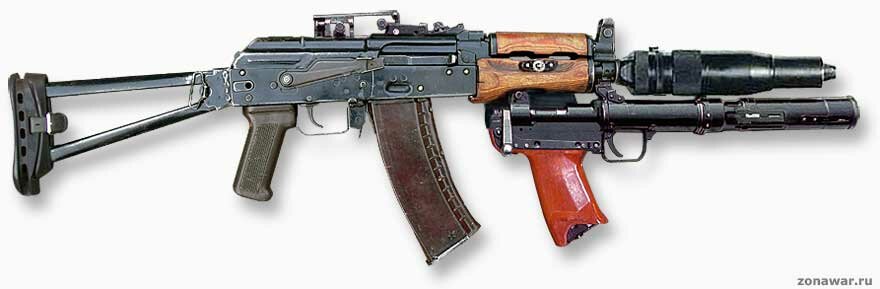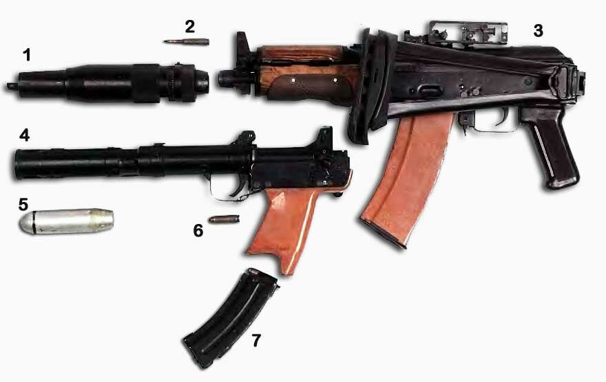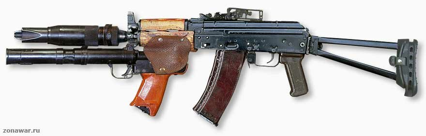 В этом компактном комплексе, выполненном на основе укороченного автомата АКСБ 74У, и поступившем на вооружение подразделений специального назначения Советской Армии в начале 1980-х годов, сочетаются не только два типа снарядов (пуля и граната), но и два основных принципа снижения уровня звука выстрела — расширение пороховых газов и их отсечка в камере.