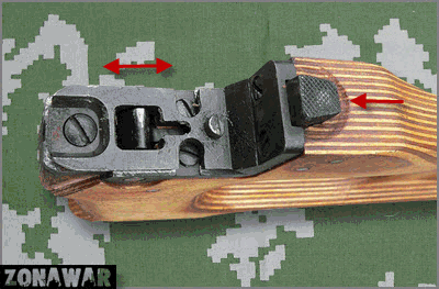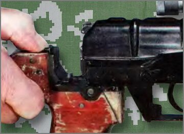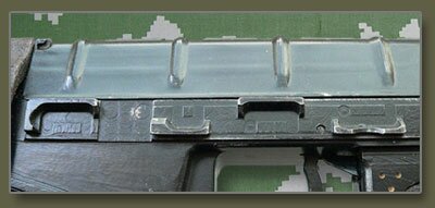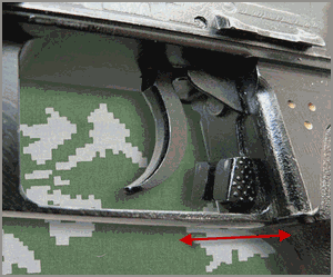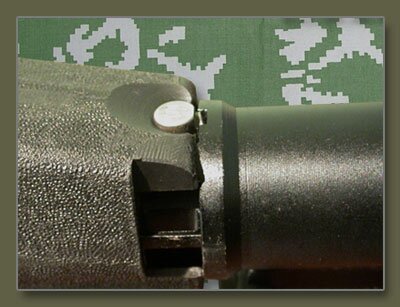 | Для уменьшения шума при ударе подвижной системы в заднем положении в конструкции упора возвратного механизма предусмотрена полиуретановая прокладка. | Для предотвращения проникновения пороховых газов, выполнивших работу перезаряжания, из ствольной коробки к лицу стрелка между выступом упора возвратного механизма и крышкой ствольной коробки имеется уплотнительное резиновое кольцо. |