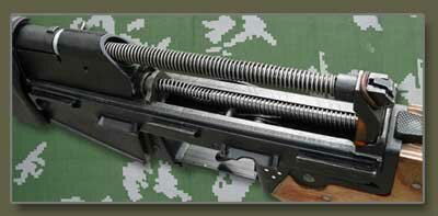 Боевая пружина служит для сообщения ударнику энергии, достаточной для разбивания капсюля патрона. Направляющая боевой пружины также имеет телескопическую конструкцию.